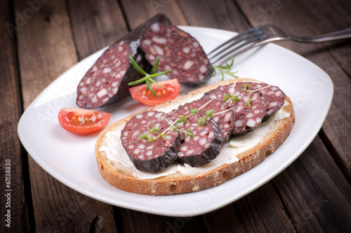 sandwich, black pudding, mealtime, picnic, break, butter, rustic, rye bread, dinner, snack, time out, food, tomatoes, butcher