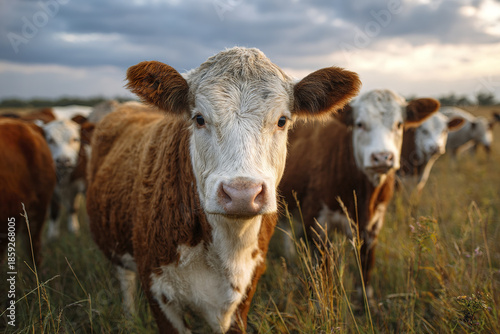 Brown and white cows grazing in natural grass field under cloudy sky, showing calm livestock in open rural environment during daylight
