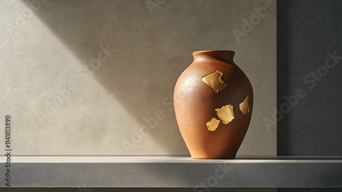 Brown clay vase with golden repairs on a minimalist shelf, showcasing the blend of traditional artistry with contemporary home decor