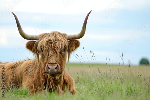 laying, field, green, grass, wildflower, animal, mammal, farm animal, agriculture, rural, farm, domestic, relaxation, resting, sunny, sunlit, nature, countryside, fur, bovine, cattle, domesticated, mammalian, herbivore, large, gentle, horned, big, beautiful, grazing, pasture, lazy, lying, idylli