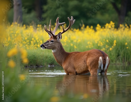 Brown deer with antlers stands in water. Animal cools down on a hot summer day near flowers, green trees. Wild mammal drinks, paddle in lake in nature.