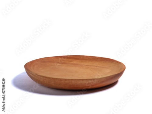 Brown empty round wooden plate isolated on white background