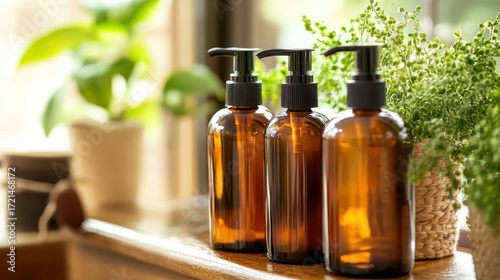Brown Glass Bottles with Pumps and Green Plants on Wooden Surface