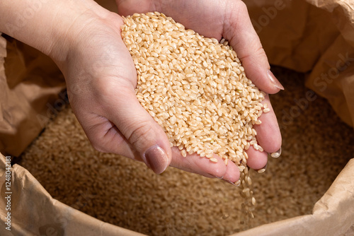 brown rice, rice, grain, hand, farming, grain, crop, rice, food, copy space, hood, food, grain