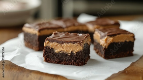 Brownie squares with a layer of peanut butter, served on a white napkin generative ai