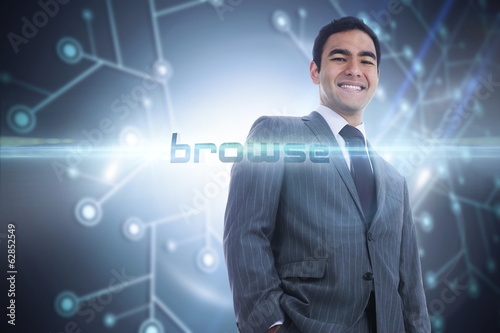 young adult, man, male, digital, computer graphic, blue, black, glowing, light, shine, computing, technology, line, connecting, circuit board, interface, computer, tech, abstract, tile, businessman, suit, well-dressed, brown hair, short hair, business, professional, corporate, career, standing, happy, smiling, cheerful, browse, text, cyberspace, online
