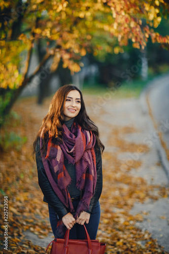 caucasian, woman, female, girl, lady, adult, attractive, brunette, beautiful, young, pretty, cute, model, fashion, casual attire, style, modern, lifestyle, carefree, look, stylish, urban, fresh, healthy, slim, elegant, leisure, outfit, autumn, season, fall, park, nature, leaf, orange, relax, october, yellow, tree, forest, colours, september, leaf, gold, foulard, sunny, outside, background
