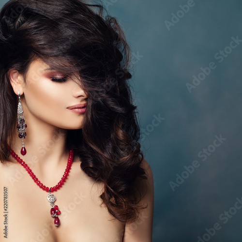 Brunette woman with wavy hair. Gorgeous female model with curly hairstyle, closeup portrait