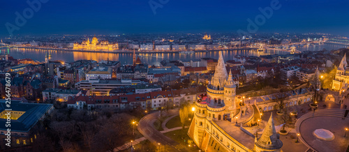 Budapest, Hungary - Aerial panoramic skyline view of Budapest with illuminated Fisherman's Bastion, Parliament of Hungary, Szechenyi Chain Bridge and St Stephen's Basilica at blue hour