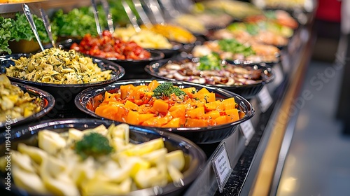 Buffet style dinner with a diverse assortment of appetizing dishes entrees and culinary delights artfully arranged on a table