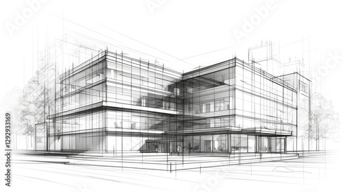 Building sketch design showcasing modern architecture with multiple levels and large windows in a serene outdoor setting