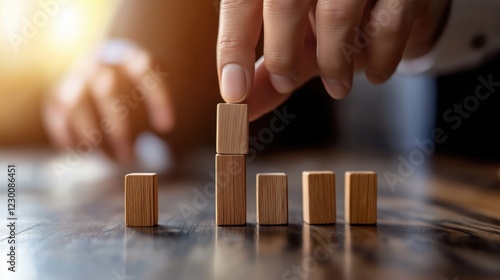 Building success strategic wooden block stacking office space business concept bright environment close-up view