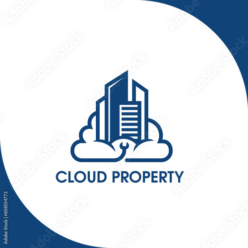 buildings on a cloud vector. City build on clouds. Logo for property real estate business or apartment maintenance service providers. Symbol for property or house cleaning in blue color. Modern tech.