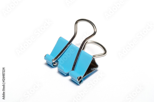 Bulldog clip, blue color paperclip on isolated white background.