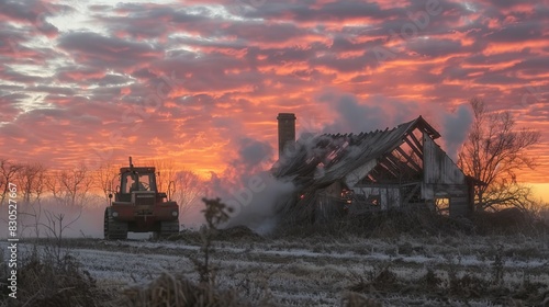 bulldozer, dismantle, barn, heavy, smoke, nearby, chimney, serene, sunset, darkness, scenery, abandon, demolish, wreckage, destruction, structure, tranquil, construction, impact, smoulder, horizon, salvage, evening, decay, progress, sundown, danger, daylight, emission, abyss, debris, machinery, equipment, wasteland, contrast, landscape