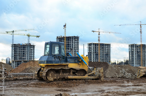 Bulldozer during of large construction jobs at building site. Land clearing, grading, pool excavation, utility trenching and foundation digging. Crawler tractor, dozer, earth-moving equipment.