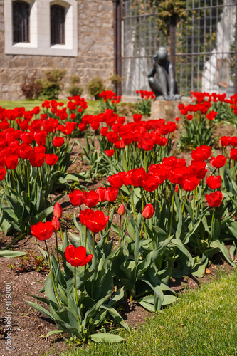 Bunch of beautiful red roses in garden with statue