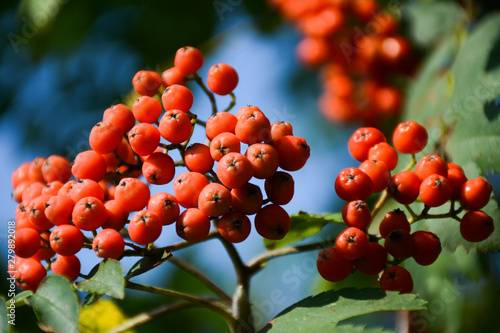 Bunch of orange rowanberry (ashberry) on blue sky background