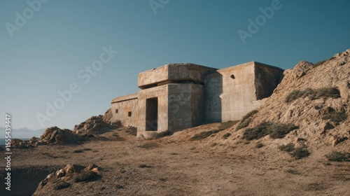 Bunker ruins atop a desert hill under a cloudless azure sky at daytime