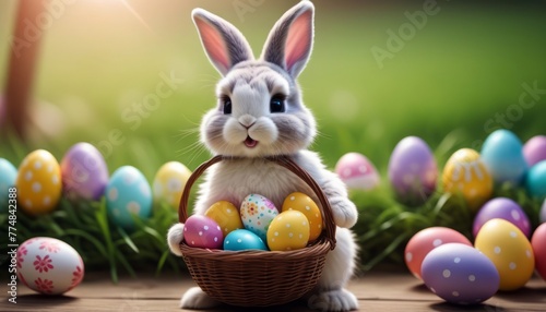 rabbit, sitting, basket, egg, colourful, fluffy, adorable, cute, animal, domestic, pet, easter, holiday, celebration, tradition, festive, spring, season, arrangement, display, decoration, joyous, indoor, cosy, rabbit, mammal, small, fur, soft, whisker, calm, content, pose, pastel, seasonal, decoration, homegrown
