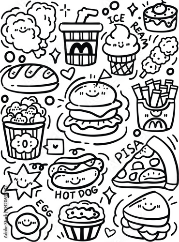 food, icon, cake, vector, hot drink, illustration, set, hamburger, sandwich, cartoon, cupcake, fast, dessert, burger, drink, breakfast, pizza, fast food, tea, bread, icon, candy, cheese, cup, chocolate
