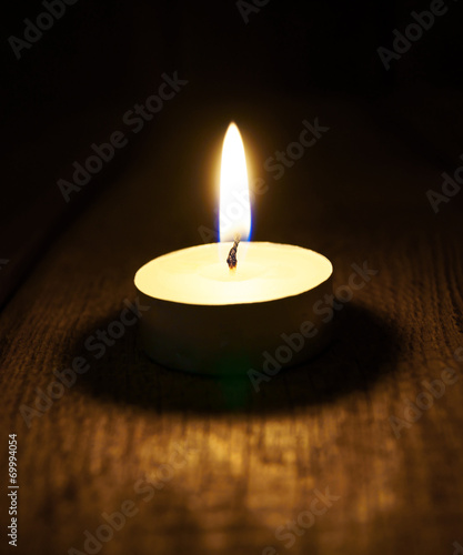 Burning candle. On wooden background.