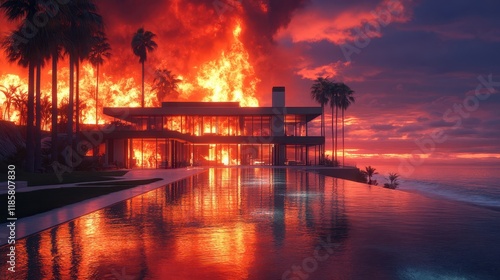 fire, infinity pool, sunset, palm tree, modern architecture, disaster, flames, dramatic sky, ocean view, smoke, evening light, destruction, emergency, architecture, heat, tragedy, waterfront, tropical paradise