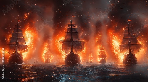 Burning ships in a dramatic naval conflict.