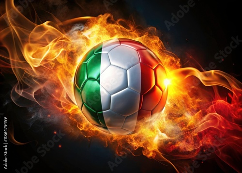 football, fire, flames, burning, italy, italian flag, mexico, football, soccer, competition, rivalry, passion, heat, intense, dramatic, hi-res, photorealistic, detailed, colours, vibrant, imagery, image, artwork, italian culture, sport, game, clash, conflict, fiery, inferno, blaze, combustion, flag, tricolour, green