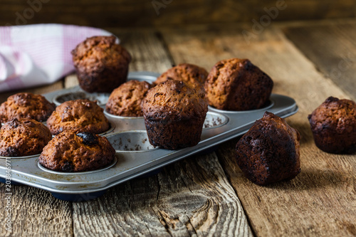 Burnt muffins in baking pan on rustic wooden table