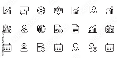 business, finance, icon, set, collection, outline, line, minimalist, chart, graph, calendar, user, profile, datum, analysis, money, currency, document, report, design, element, vector, symbol, signs, simple, black, white, background, web, app, interface, growth, statistic, management, office, professional, graphic, illustration, isolated