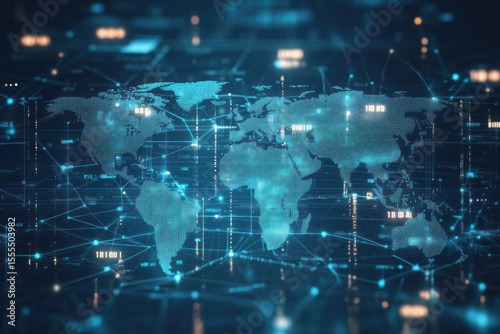 Business and tech fusion design with info graphics, world trade routes, and social data