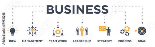 Business banner web icon vector illustration concept with icon of management, idea, management, team work, leadership, strategy, process and goals