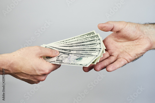 Business closeup of two hands exchanging dollars on grey background.