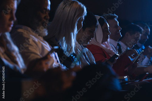 professional, business, businesswoman, businessman, associate, occupation, profession, sitting, looking, smiling, holding, smartphone, mobile phone, mobile phone, phone, wireless technology, communication, global communication, connection, auditorium, stage, seat, seating, seminar, conference, meeting, training, demonstrating, corporate, global, education, teamwork, together, architecture, entertainment, performance, presentation