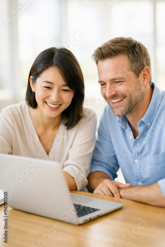 Business colleagues smiling while working on laptop as teamwork and collaboration concept
