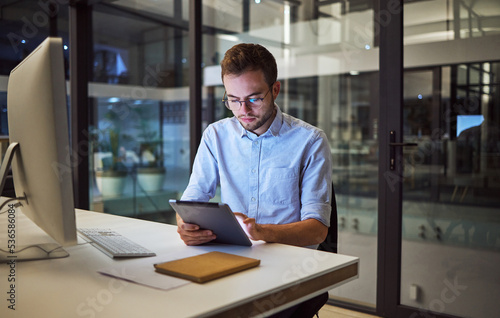 Business, communication and overtime, man with tablet and computer at desk. Late night at office, working on deal or internet project. Corporate worker in glasses, checking online financial report.