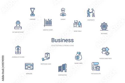 business concept 14 colorful outline icons. 2 color blue stroke icons