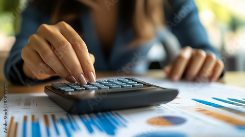 Business finance and accounting concept. Businesswoman using calculator to calculate financial report