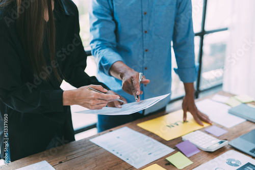 Business financial team work together in project brainstorm meeting. Cooperate teamwork, strategy planning, small business startup company, or office coworker concept.