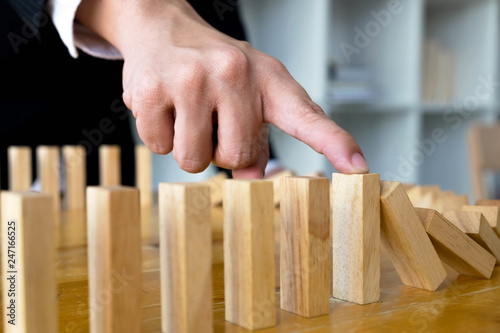 Business finger stops domino continuous overturned meaning that hindered business failure. Stop over this business failure concept.