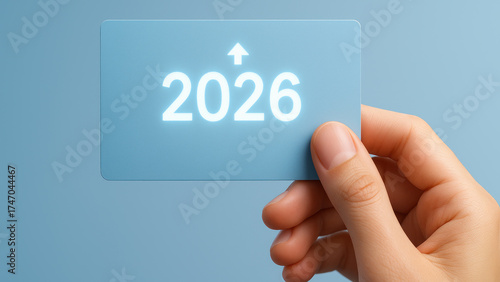 business, growth, 2026, target, goal, achievement, card, hand, finger, arrow, glow, year, future, success, finance, planning, progress, upward, blue, minimal, modern, closeup, idea, strategy, vision, milestone, promotion, investment, corporate, optimistic, leadership, decision