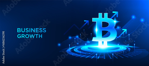 Business growth bitcoin concept in futuristic digital style. Glowing cryptocurrency symbol with financial chart and upward arrow on blue background. banner, cover, vector illustration
