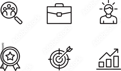 Business Icons Set: Collection of business and career symbols, perfectly illustrating concepts of teamwork, job search, innovation, and achievements, ideal for business design.
