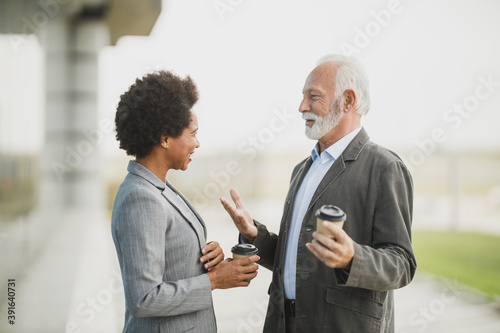 colleague, hot drink, break, multi-ethnic, success, two people, talking, smiling, street, black, businesswoman, senior, businessman, team, cheerful, real people, co-worker, happy, adult, man, woman, african, american, ethnicity, mature, businessperson, discussion, togetherness, city, modern, building, employee, entrepreneur, manager, communication, lifestyle, professional occupation, horizontal