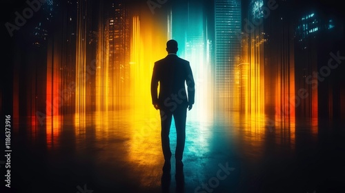 Business leader in neon cityscape urban environment digital art futuristic atmosphere dramatic perspective