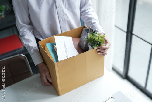 Business man sending resignation letter and packing Stuff Resign Depress or carrying business cardboard box Change of job or fired from company resign.