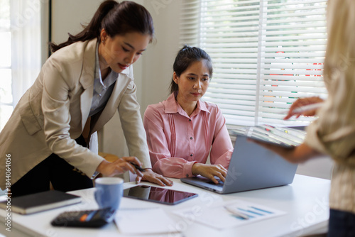 Business meeting. analyst team utilizing BI Fintech to analyze financial report with laptop. Businesspeople analyzing BI data dashboard displayed on laptop screen for business insight. Prodigy