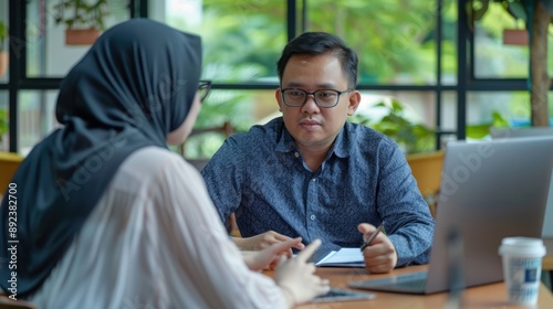 business, meeting, cafes, people, conversation, discussion, working, co-worker, workspace, team, project, collaboration, laptop, notebook, pen, hot drink, desk, table, chair, window, goggles, woman, man, female, male, indoor, office, professional, serious, sharpened, concentrated, communication, idea, solution, strategy, planning, casual attire, modern, lighting, interior, design, bright, comfortable, cosy, relaxed, light, natural