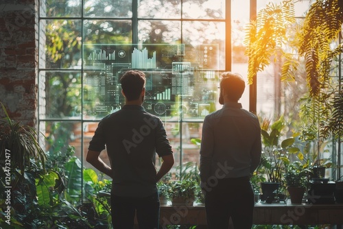 Business meeting on data analytics modern office digital insights indoor greenery two perspectives